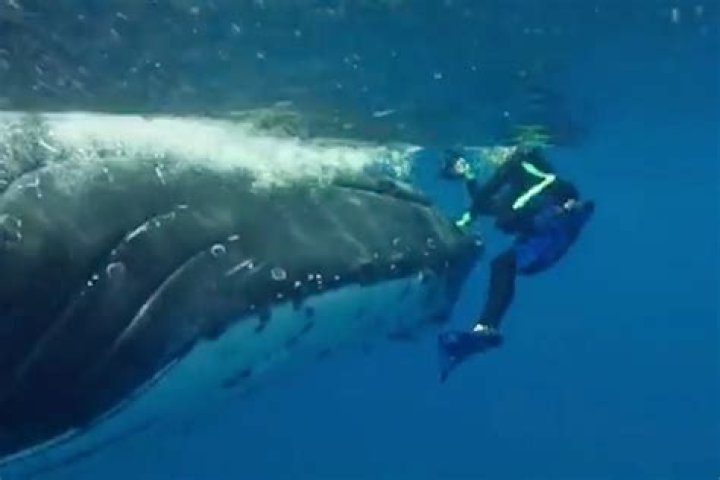 Later on, after 1 year, when she was in Rarotonga she found the same whale again. He came near her, and she immediately dived into the water.